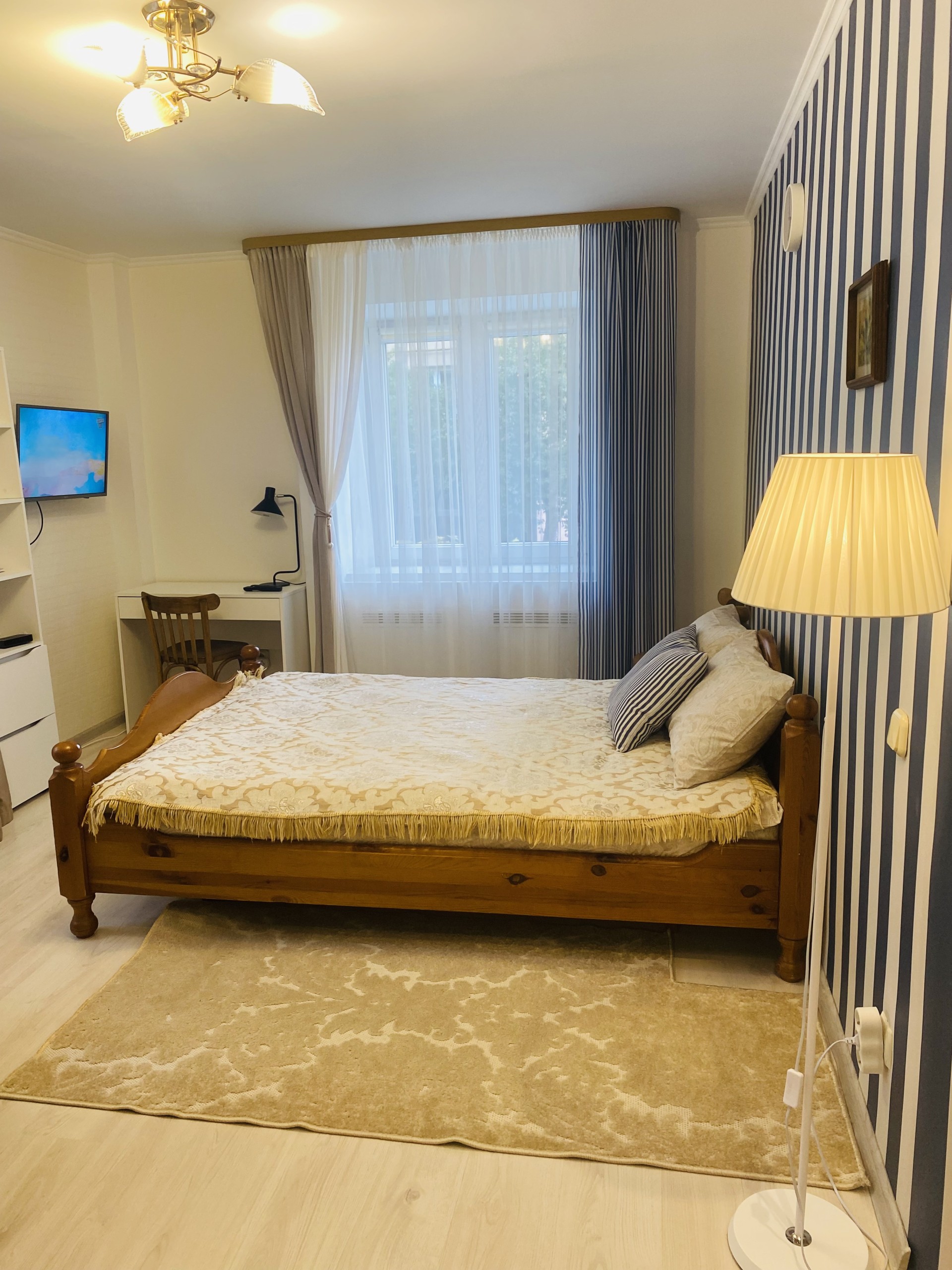 Двуспальная кровать из массива (новый матрас)+ возможно дополнительное спальное место для ребенка или взрослого по договоренности.В квартире курение запрещено .Первый этаж. Будние дни 1 человек-60 р,2 человека-70 р.Выходные 80 р-1/90р-2.