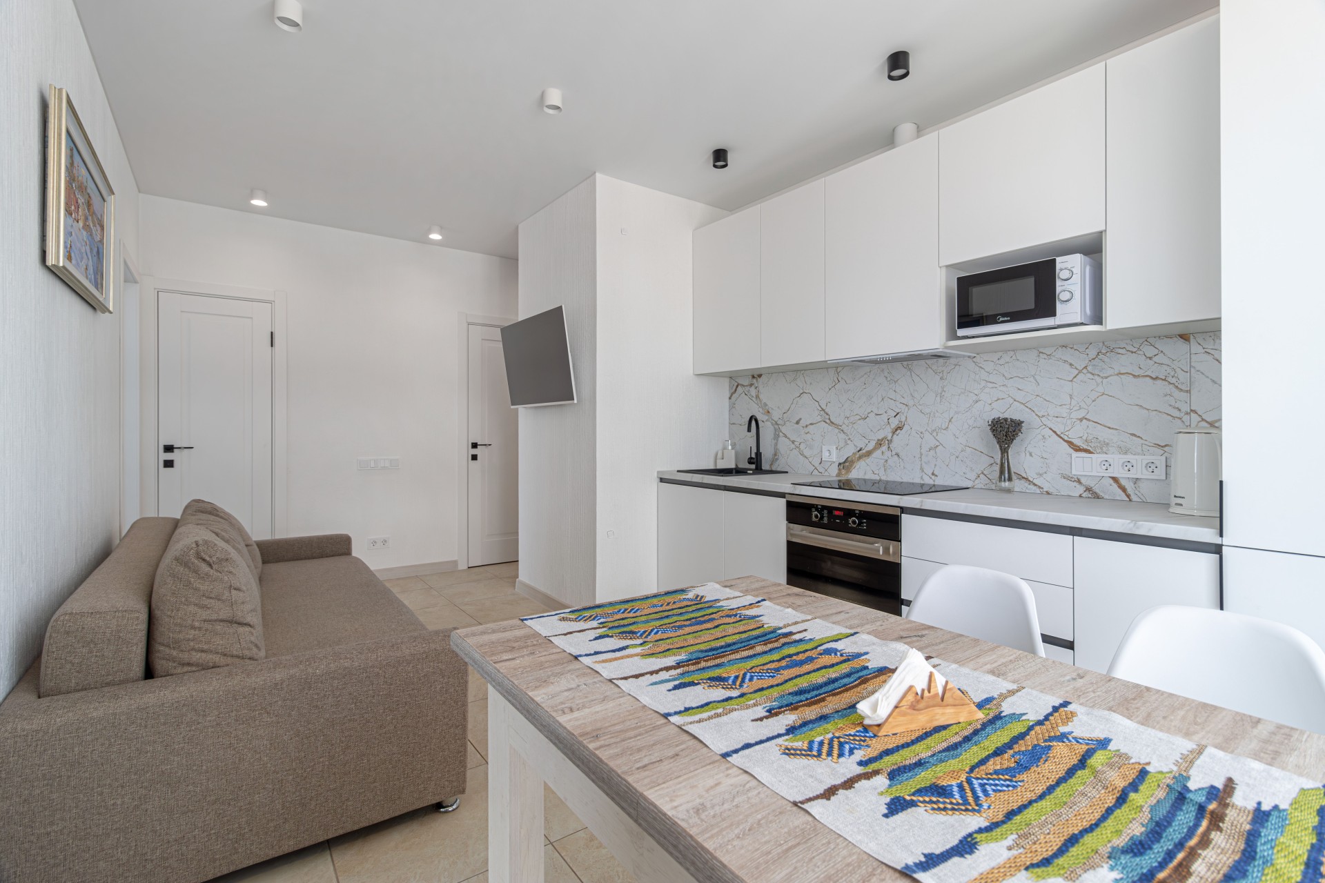 Большая новая квартира для удобного размещены большого количества гостей. Три изолированные спальни. Раздельный санузел.
