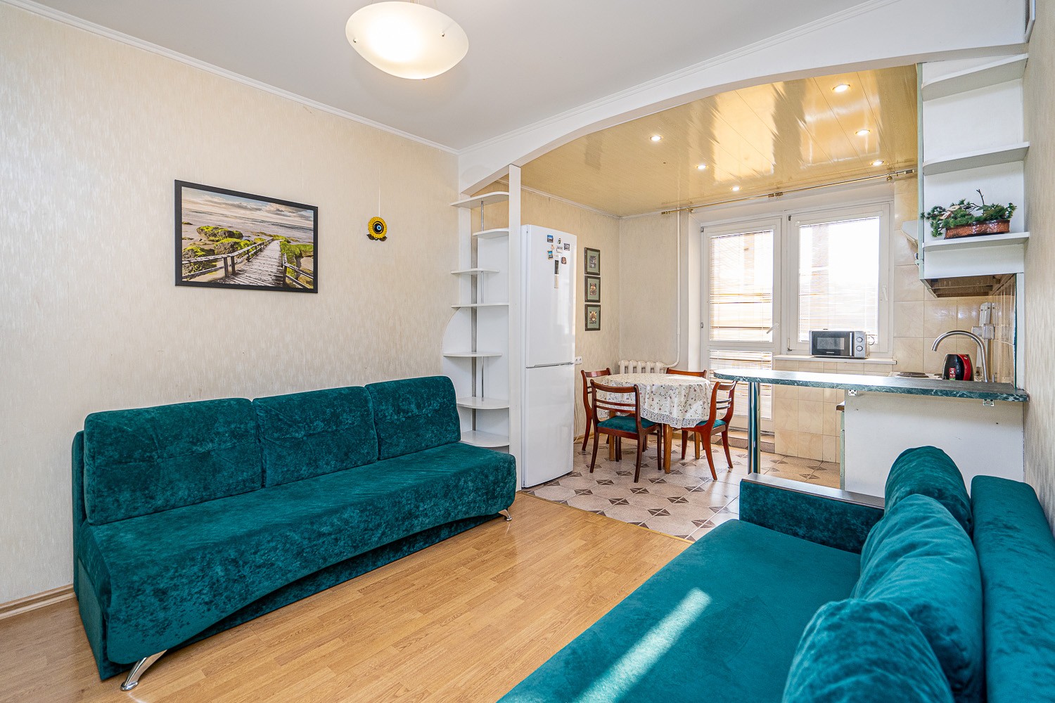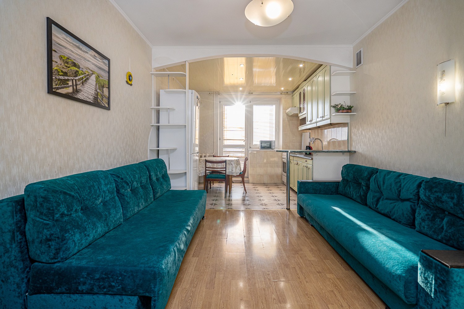 В квартире 6 раздельных спальных мест или размещение 2+2+2+2+2+1. В рекламе указана минимальная цена за сутки проживания на 2-3 гостя. В праздничные и выходные дни цена договорная.