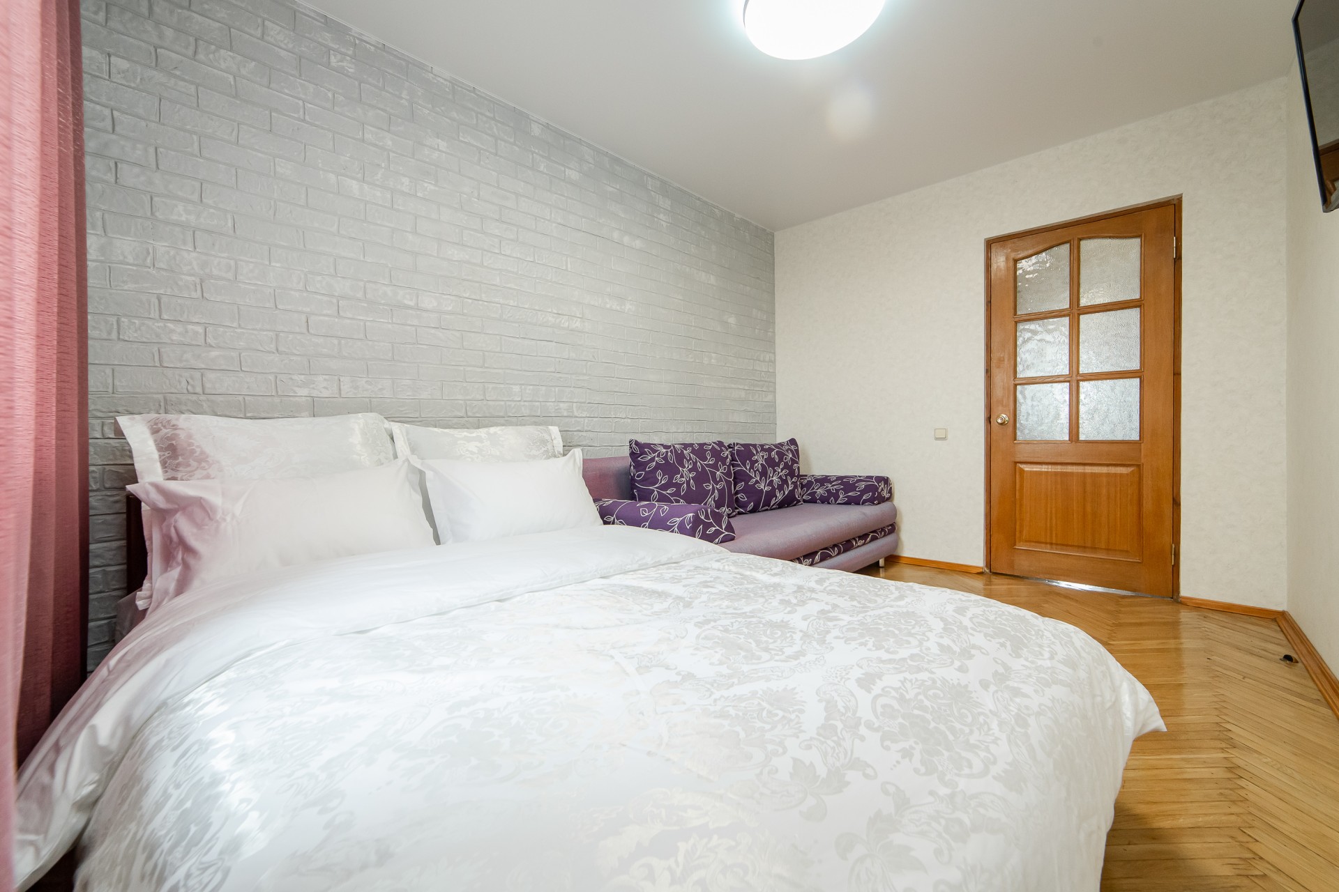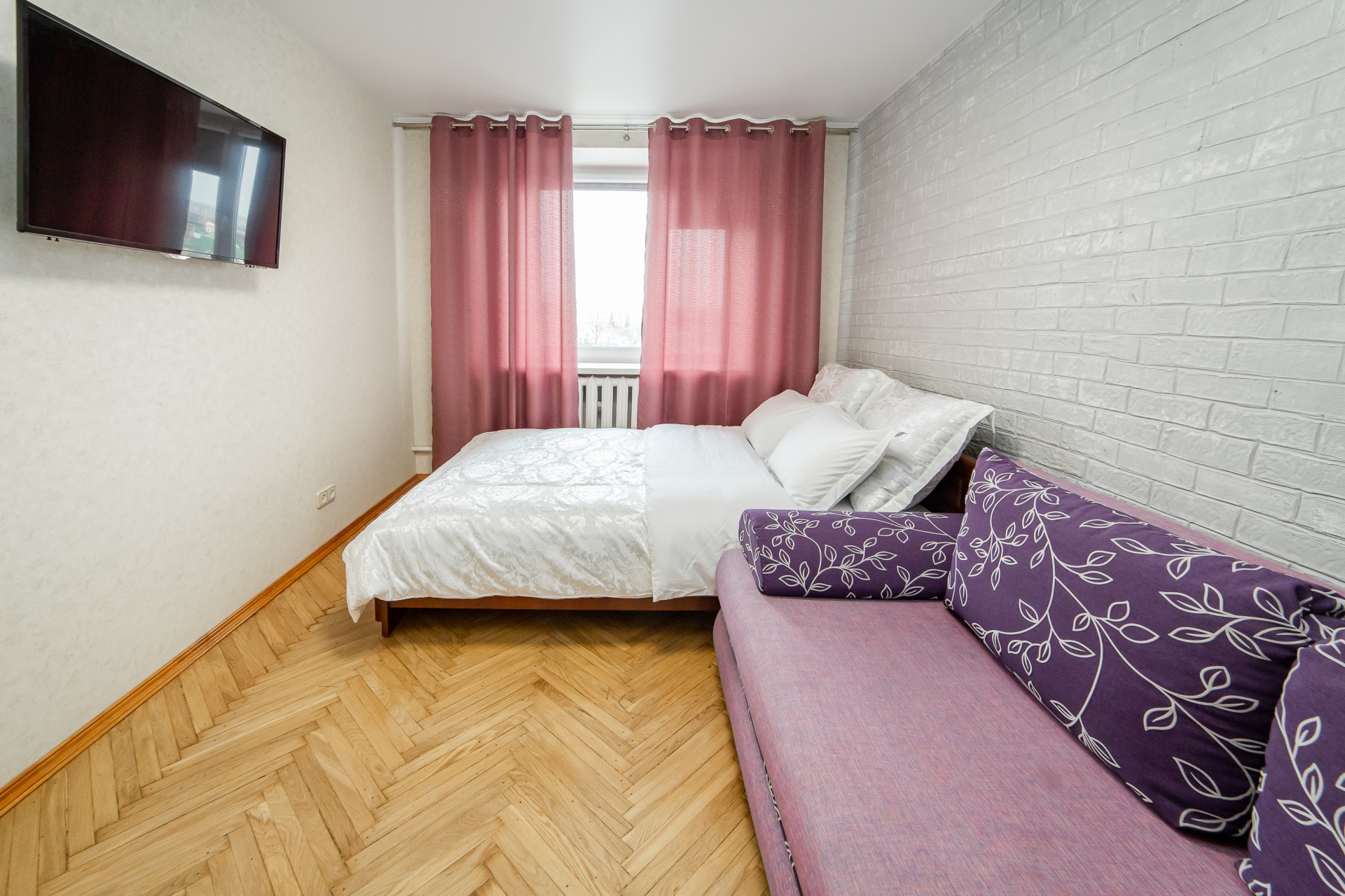 - Первая комната: уютный балкон с выходом во двор, двуспальная кровать, раскладной диван и большой телевизор — отличный уголок для отдыха.