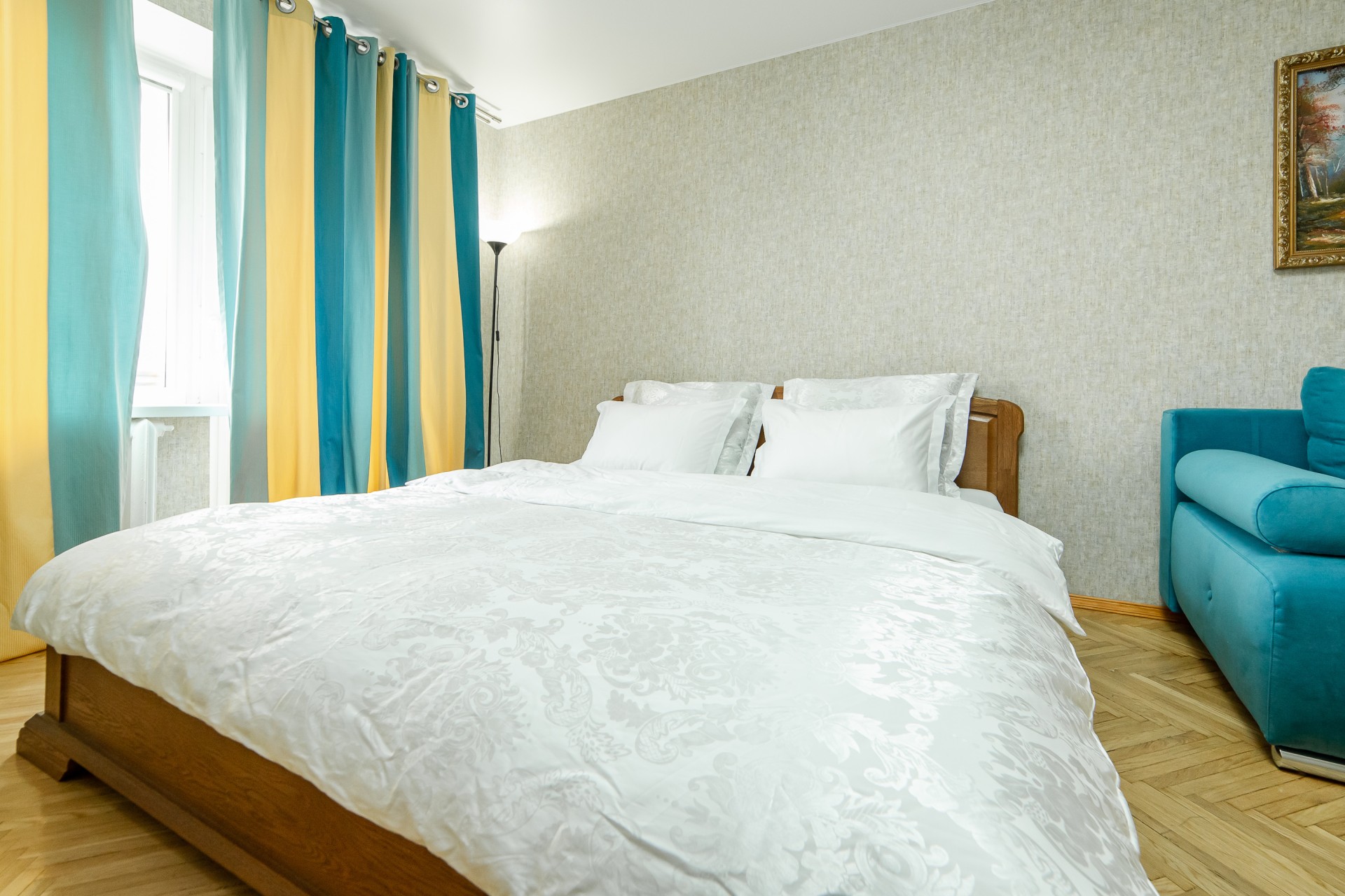 - Третья комната: просторная двуспальная кровать и раскладной диван — дополнительное место для отдыха или гостей.