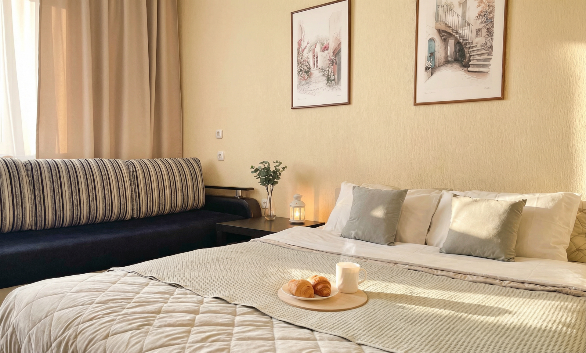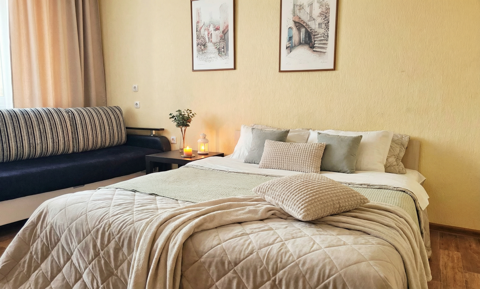 - двуспальная кровать и комфортный диван;