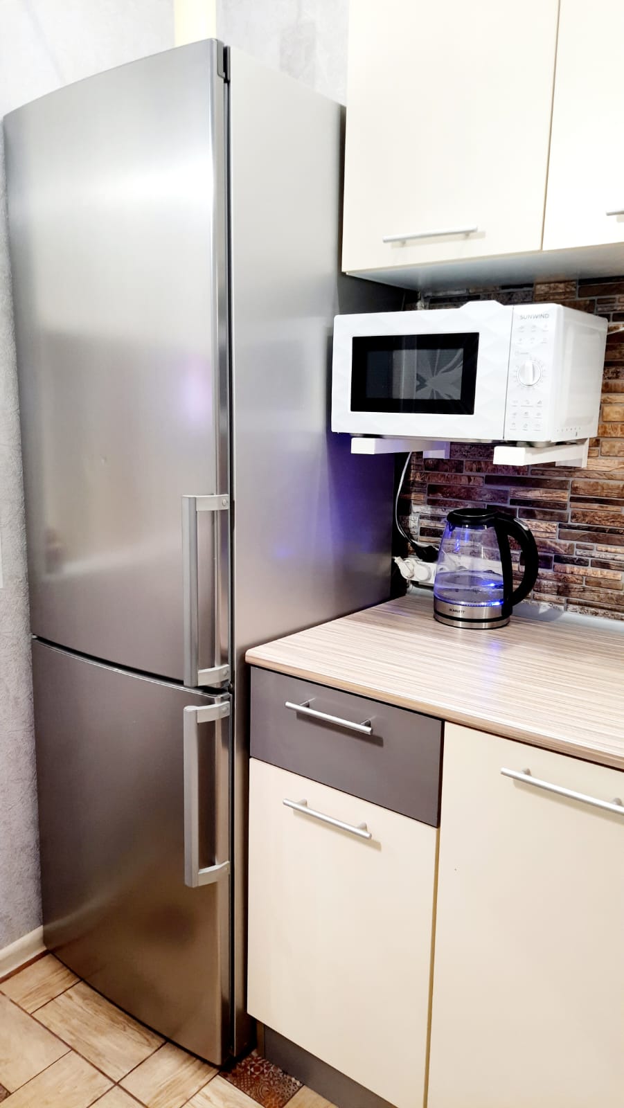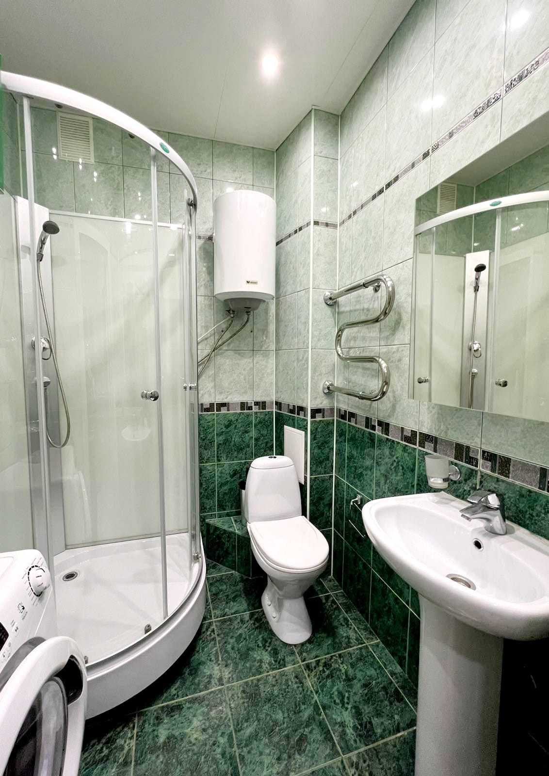 - смарт ТВ, wi-fi; стиральная машина,холодильник, чайник, СВЧ, утюг+доска,сушилка, фен, посуда, бокалы.
